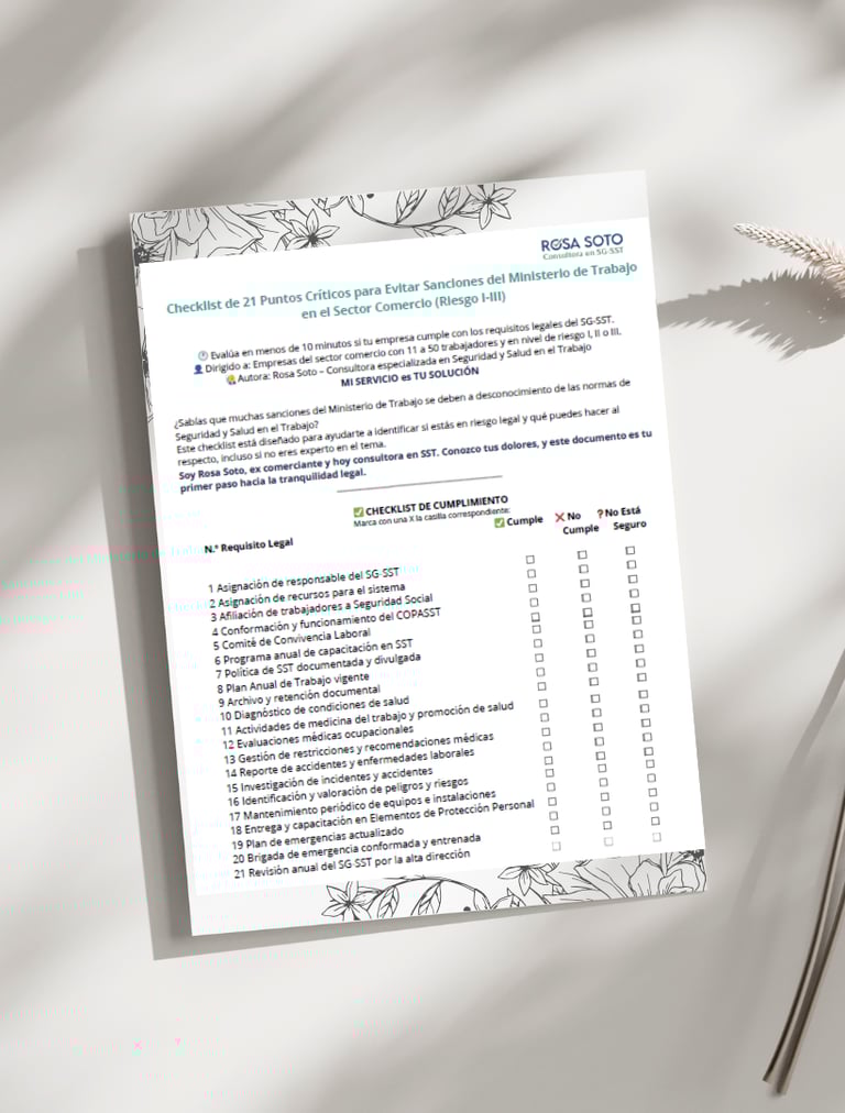 Ideal para empresas del sector comercio con 11 a 50 trabajadores en Riesgo I, II o III. Evita sanciones, organiza tu empresa y protege a tus trabajadores hoy mismo.